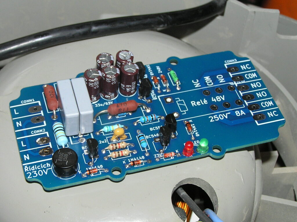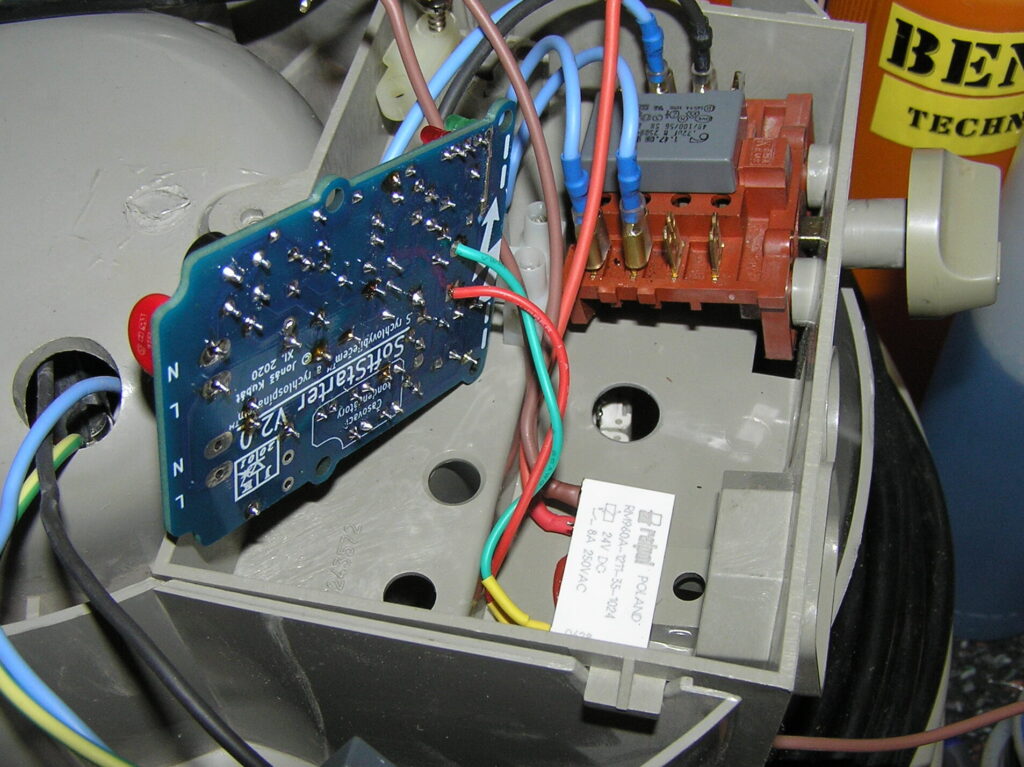 Celá destička SuperSoftStarteru (odkaz) se tam nevešla, relé je proto umístěno pod destičkou.