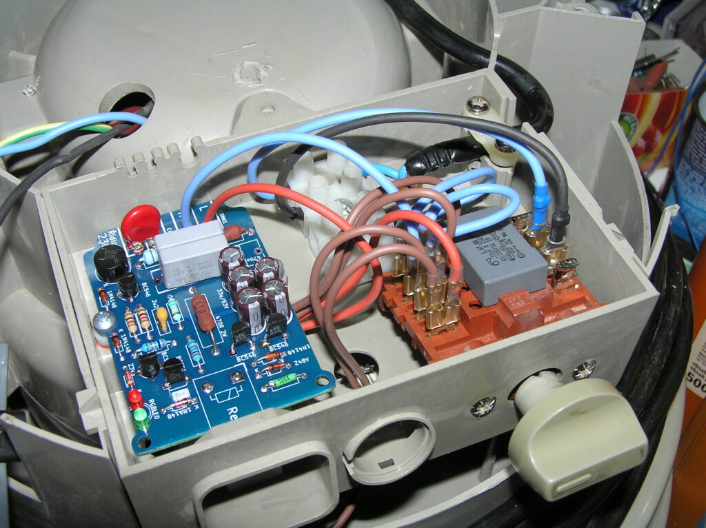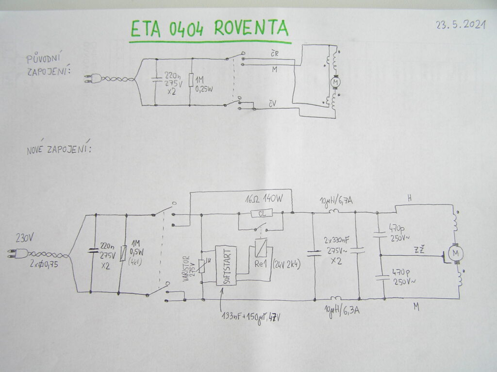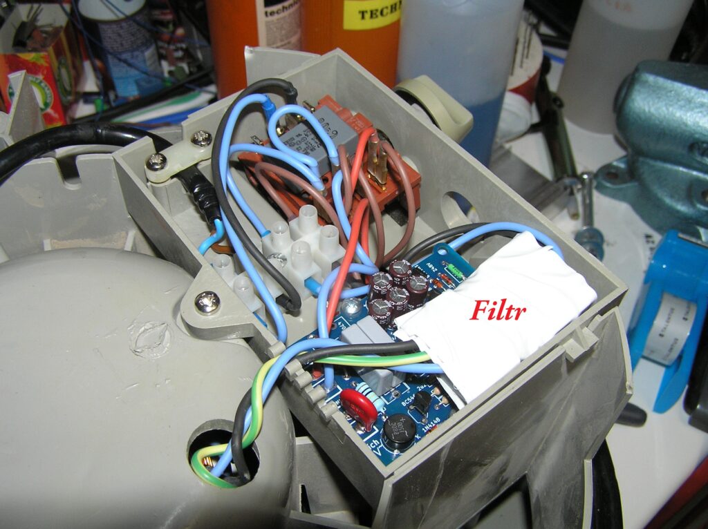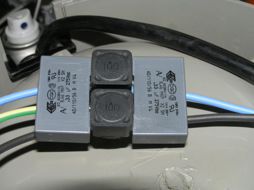 Nakonec jsem se ještě inspiroval moderními spotřebiči a před motor zařadil odrušovací filtr ze 2 tlumivek 10μH/6,7A s uzavřeným feritovým jádrem, 2 kondíků 330nF/275V~ X2 mezi fází a nulou a 2 keramik 470pF/250V~ Y2 proti kostře motoru vyvedené žlutozeleným vodičem,